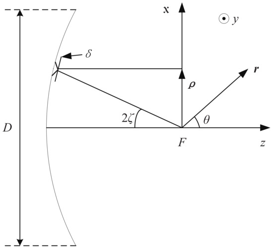 To analyze the influence of the surface shape accuracy on the antenna gain, the radiation characteristics of the antenna with the surface shape error must be studied first. The geometry of a parabolic reflector with random surface errors is depicted in Figure 3. The aperture has a diameter and a focal length F, A is the projected region on the focal plane with the polar coordinates and , and is the unit vector in the observation direction. Here, the amplitude aperture distribution is