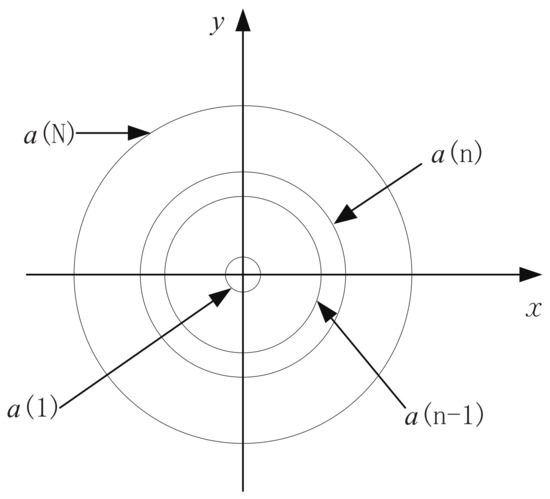 The model of [9] is adopted. It is assumed that the reflector aperture is divided into N annular regions as shown in Figure 4, where , and . By assuming that the phase errors in the annular region and in the annular region are statistically independent and have Gaussian distribution with zero mean and standard deviation equal to and , respectively, the radiation pattern of the antenna with surface errors can be derived as