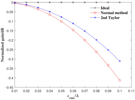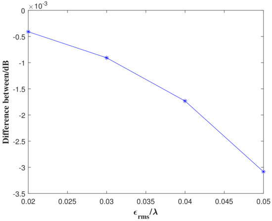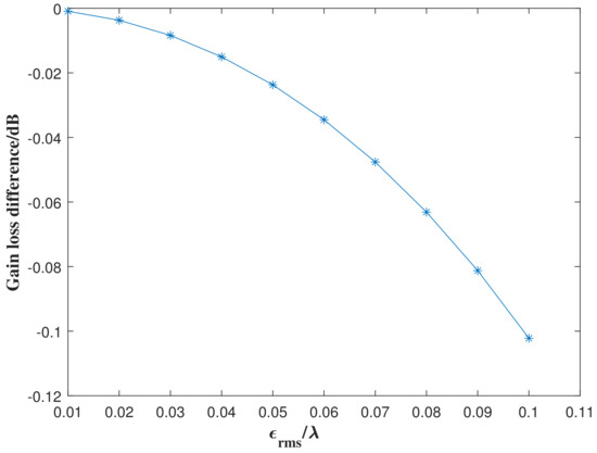 Figure 5 shows the change in the normalized gain with the antenna surface errors. From the curve in the figure, it can be seen that the difference between the conventional algorithm and the second-order Taylor expansion algorithm is very small. When , there is a difference of only 0.1 dB. Figure 6 shows the difference between the gain loss obtained by applying the second-order Taylor expansion model and the Ruze equation, which is also negligible.