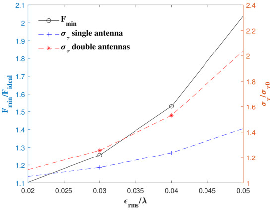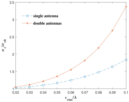 The results calculated by both methods in Figure 5 clearly show that the gain of the antenna decreases rapidly with the increase in the surface errors. Next, analyze the influence of the surface error on the antenna detection capability and the performance of the VLBI system, and normalize them with the values in the ideal state as a reference. The influence of surface errors on the minimum observable flux density of a single radio telescope is shown in Figure 9. The change in the VLBI observation delay error caused by the surface shape error of a single radio telescope and two radio telescopes is shown in Figure 10, and the value in the ideal state is also used as the normalization standard. The minimum detectable flow density of the telescope or the observation delay error will increase with the attenuation of the gain, which also verifies the practical significance of launching large apertures antennas. When the ground antenna is deformed, mechanically compensated and electronically compensated, it can be implemented in order to maintain the antenna gain. However, space antennas cannot be calibrated currently when deformed.
