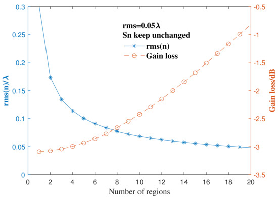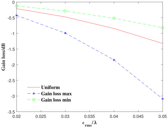 Different error distributions with the same rms error for the whole reflector result in different gain losses; in this experiment, taking as an example to illustrate. When the whole rms surface errors is constant and the weight coefficient of each region is not adjusted, place the errors in a single region in turn, and then analyze the antenna gain loss. The of the surface error of each region and the corresponding antenna gain loss are shown in Figure 11. Obviously, as the position of the errors goes from the inside to the outside, the corresponding to each ring continues to decrease. This is because, as n increases, the total surface errors’ root-mean-square remains unchanged when the weight coefficient keeps increasing, which is consistent with (16). At the same time, the gain loss changes from dB to dB; however, the gain loss is dB when the errors distribute uniformly, which means that, even if is constant, the gain loss is not necessary; that is to say, the Ruze equation is only applicable to the case where the errors are uniformly distributed. Figure 12 shows the extreme value of gain loss of different to compare the gain loss when the errors are distributed uniformly.