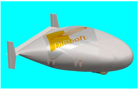 Here, we investigate a craft that differs from conventional airships. The airship presented here (Figure 1) is more like a flying wing. Hybrid airships have an exciting future, due to their increased lift compared with a conventional airship. In this sense, we can cite the pioneering airship LMH-1 from Lockheed Martin or the Airlander 10, the first Large Capacity Airship to have flown in this millennium. The flying wing shape presented here could minimise aerodynamic drag and has the advantage of presenting a larger flat (or quasi-flat), surface allowing the installation of photovoltaic cells necessary to provide a significant part of the thruster’s energy. We first set about building a dynamic model for this airship: a Newton–Euler approach was taken. Note that the Lagrangian method has also been considered in other dynamic models of airships, for example El Omari et al. [5] and Bennaceur et al. [6].