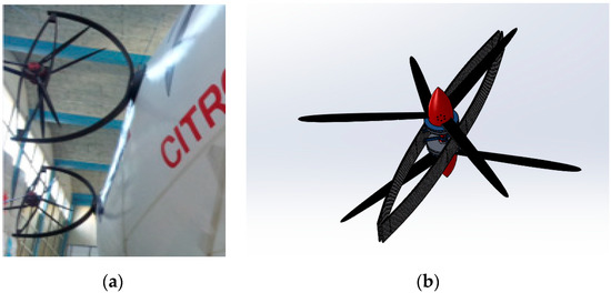 (a) Thrusters of the airship; (b) CAD details of the thrusters.
