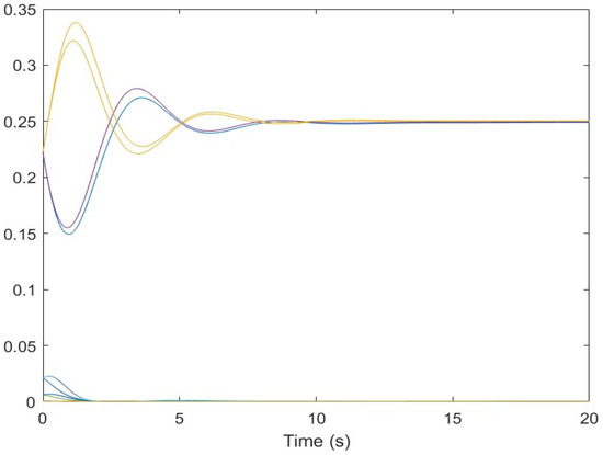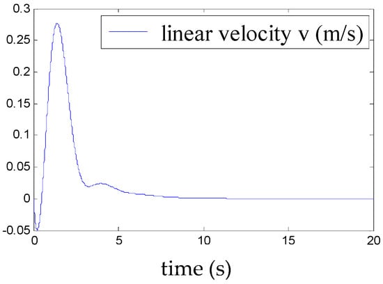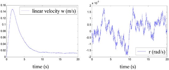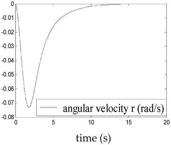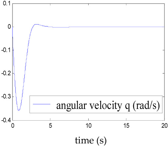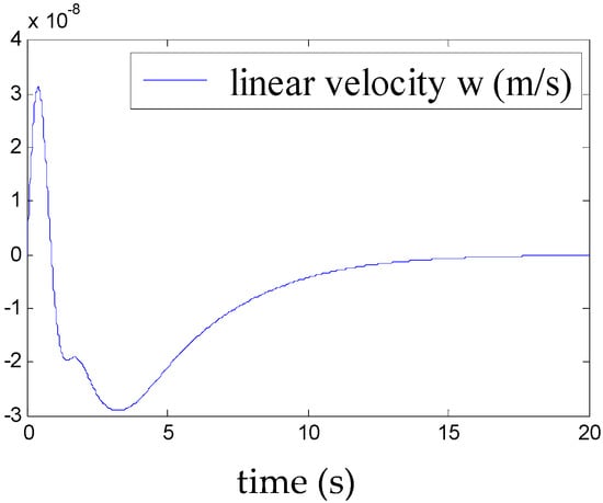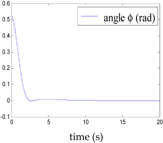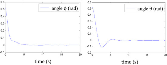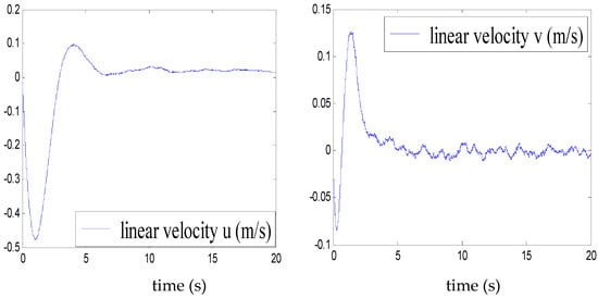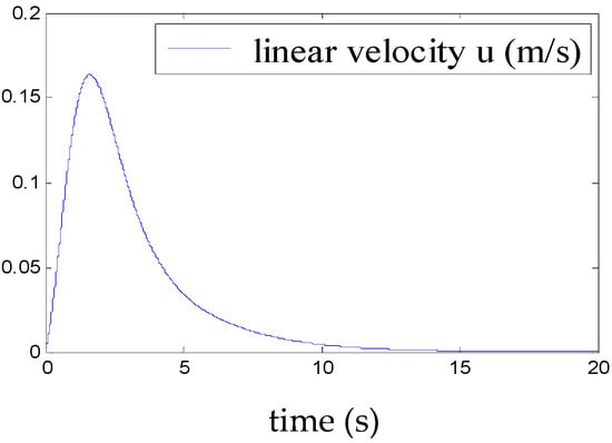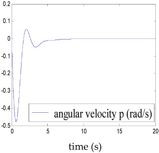 Figure 5, Figure 6, Figure 7, Figure 8, Figure 9, Figure 10, Figure 11 and Figure 12 show the stabilisation of the angles of roll and pitch, as well as their derivatives, and the convergence of the linear velocities u, v and w, in a relatively short period of time.