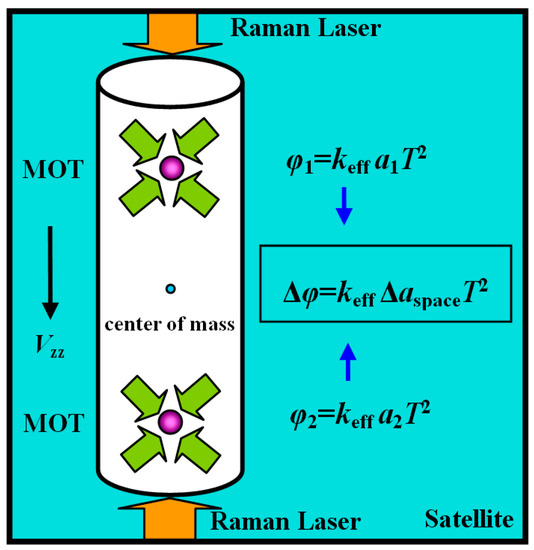 In each pair of accelerometers, the atom interferometry is realized simultaneously by using the same Raman laser beams so that common-mode noises can be effectively rejected in measuring the gravity gradient [14], such as Raman laser phase noise and vibration. In this case, the differential acceleration Δai in the micro-gravity environment can be given as [9].
