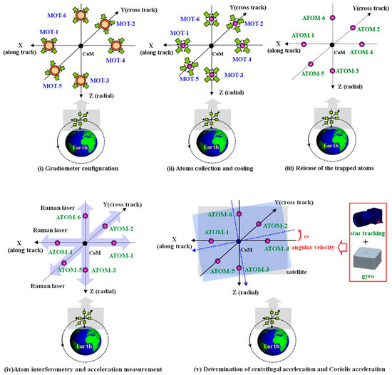 where ω = [ωx, ωy, ωz] represents the satellite angular velocity, r = [rx, ry, rz] denotes the relative position of the atom clouds with respect to the satellite CoM, and v = [vx, vy, vz] is the residual velocity of the atom clouds relative to the satellite. These accelerations should be precisely measured and controlled in order to arrive at the gravity gradient components Vii and are discussed below.