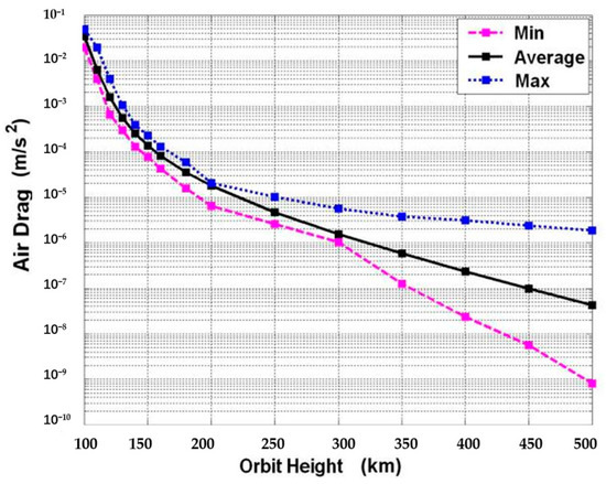 The non-conservative accelerations at LEO mainly come from the atmospheric drag in the flight direction. The acceleration disturbance adrag caused by the atmospheric drag can be formulated as , where Fdrag is the atmospheric drag force, ρ is the local atmospheric density that varies with orbital altitude and period of the solar activity, CD = 2.2~2.6 is the coefficient of the atmospheric drag force, VR is the velocity vector of the incidence atmosphere stream, Ap is the area of the satellite’s cross section perpendicular to the atmosphere velocity vector. Models of the atmospheric density are employed to exhibit an atmospheric drag variance with orbital altitude, which provides a conservative estimation of the maximum atmospheric drag acceleration with a level of 10−6~10−5 m/s2 at LEO (altitude below 500 km), as shown in Figure 5. It would cause a rapid decrease in the orbit altitude.