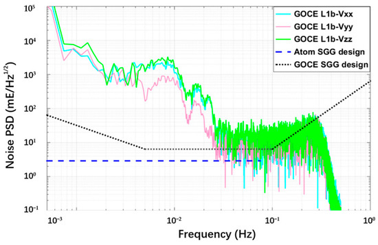 Noise PSD of diagonal components of the GGT for different SGG. The expected noise level of atom-interferometry-based SGG is described as a dashed line. The prelaunch design and in-orbit performance of the GOCE SGG are also shown by dotted and solid lines, respectively, for comparison. The in-orbit results of Vxx, Vyy and Vzz are relevant to one orbit of GOCE L1b data from the ESA official website (00:49:15–02:18:59, 1 November 2009, data length: 5384 s).