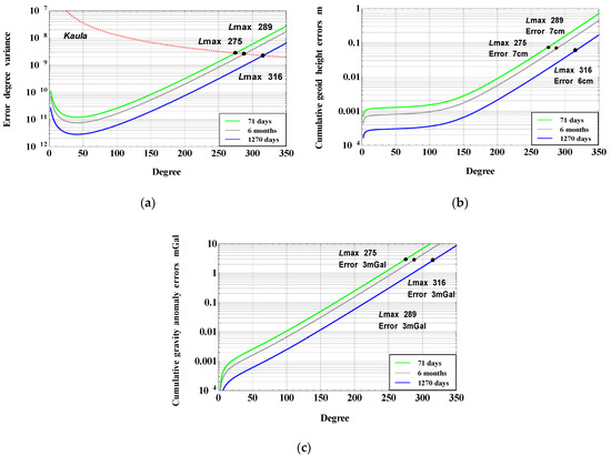 Based on the error degree variance, the resulting cumulative geoid height errors and gravity anomaly errors have been computed, and the results are described in Figure 9b,c, respectively. It is shown that atom-interferometry SGG could resolve the Earth’s gravity field model with an accuracy of 7 cm in terms of geoid height and 3 mGal in terms of gravity anomaly at degree and order of Lmax = 275 based on a data length of 71 days. Furthermore, an accuracy of 7 cm in terms of geoid height and 3 mGal in terms of gravity anomaly at degree and order of Lmax = 289 can be achieved based on 6 months of data. In addition, the accuracy of the atom-interferometry-based model is estimated to be 6 cm in terms of geoid height and 3 mGal in terms of gravity anomaly at degree and order of Lmax = 316 based on 1270 days of data, assuming a longer lifetime for future gradiometric missions.