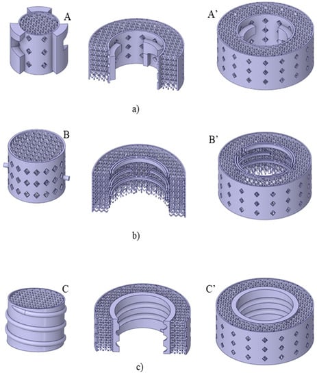 CAD models of the interlock designs, iso view of core and shell with cross-sectional shell view for (a) U-lock: core (A) and shell (A’); (b) Twist-lock: core (B) and shell (B’); (c) Thread: core (C) and shell (C’).