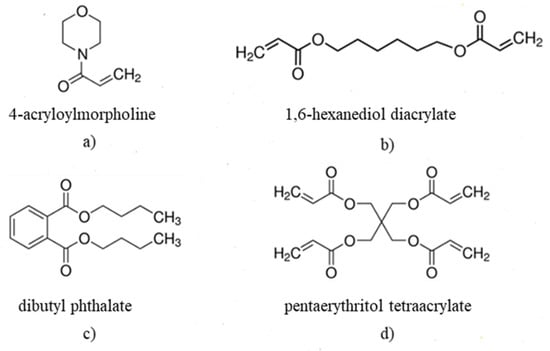 Chemical structure of the resin components: (a) 4-acryloylmorpholine; (b) 1,6-hexanediol diacrylate; (c) dibutyl phthalate; (d) pentaerythritol tetraacrylate.