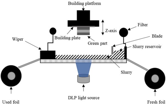 The main components of the machine (Figure 3) are (i) the building platform with a build plate, (ii) glass bottom, (iii) light projector, (iv) slurry reservoir, (v) wiper and (vi) foil rolls. In the first step of the printing process, the slurry is transported on the foil from the reservoir to the building area by the rotating foil system. The building platform then descends until the distance between the platform and the slurry layer is equal to one-layer thickness. The light projects the slice information to the slurry layer and the illuminated suspension is cured for several seconds. The building platform ascends, the excess slurry is transported to the wiper and pumped back into the reservoir. A new slurry layer is recoated, and the platform descends to a distance equal to a one-layer thickness between the first cured layer and the slurry layer. The next layer is then cured and adhered to the previous layer. The process of slurry transport and layer-by-layer curing is repeated until the product is built.