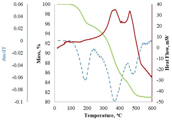 From the TGA/DSC curve presented in Figure 5, it can be observed that the first mass loss of 3.6% begins to occur when the temperature is between 115 and 250 °C. This weight loss of 3.6% is assigned to the evaporation of the adsorbed water and residual cleaning solution. Within the temperature range and employed testing conditions, no peak was observed in the DSC curve []. The second rapid mass loss with a peak of 375.9 °C had a mass loss of 8.7%. The final mass loss occurs between 450 °C and 575 °C and is equal to 6.9%. Beyond 575 °C there is a negligible mass loss. According to the DTG curve, the extremum points of mass loss rate appear at 191.2 °C, 375.9 °C and 481.3 °C. The total mass loss is 19.2 wt%. Based on the composition of the prepared, uncured resin the total weight loss is slightly greater than expected, implying total burnout of the binding components. The excess weight loss might be attributed to adsorbed water during storage or the leftover dibasic ester. From the DSC curve, it can be concluded that the thermal debinding reaction is an exothermic process with two major peaks attributed to the oxidative decomposition of polymer chains (372.2 °C) and the thermal decomposition of the crosslinked polymer network (464.1 °C) []. The DSC curve also showed a weak peak at 70.8 °C, that may be a result of an artifact caused by the toppling over of the sample in the pan. According to the results of TGA and DSC curves, the parameters of the debinding process are determined. The temperature was first raised from room temperature to 190 °C and then kept for 2 h. After that, the temperature was raised to 375 °C and maintained for 4 h to allow enough time for the decomposition of the organic matter and reduce the effect of thermal stress on the sample. The next step was heating to 480 °C with a dwell time of 2 h. Finally, the temperature was continuously raised to 650 °C to ensure that the resin was completely removed, and then naturally cooled to room temperature. The whole debinding process took a total of 62.5 h without cooling.