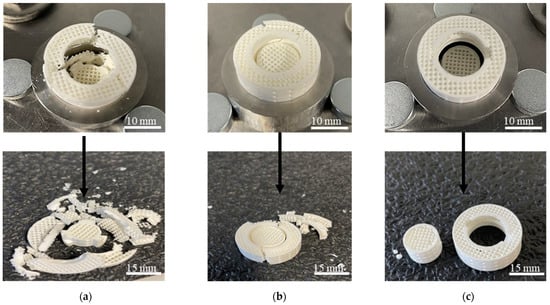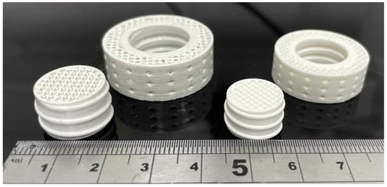 The green parts are shown in Figure 6. The parts show sufficient quality after sacrificial layer removal and cleaning, no flaws were determined by visual inspection in the green stage and the green strength was high enough for handling. The layering effect is visible on the surface of the green and sintered parts, which was expected due to the employed additive layering process and over curing. According to the findings of our earlier work, the manufacturability of lattice structures is affected by the cure depth and the size of the exposure area of the sliced layer []. The struts of the lattices tend to be very fragile due to their small cross-sectional area, and it is not uncommon to experience complete breakage during the build.