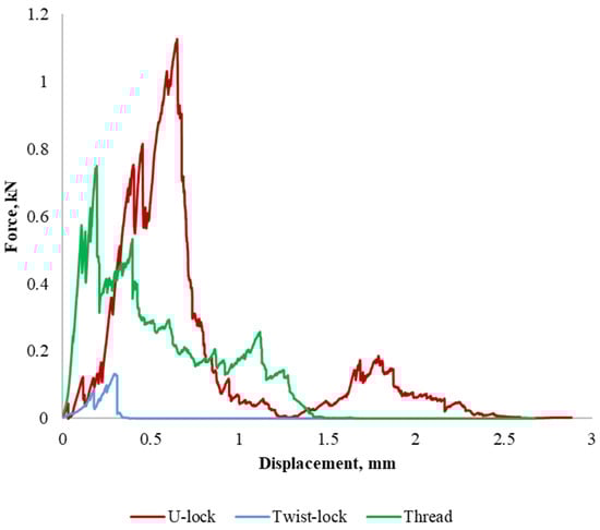 For the Twist-lock specimen, the force–displacement curve presents two force peaks associated with the snapping of the side pins from the surface of the cylindrical core substrate. This is due to the small area of the pins, which did not provide enough resistance to the applied force before failure. Once the pins snapped off, the force decreased and plateaued as the core slid out of the outer substrate leaving the interlocking system of the outer shell intact as seen in Figure 10c.