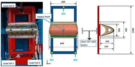 To capture realistic bird impact events, it is important to consider the numerical approaches which should comply with the experimental test articles. Therefore, in this present research, the leading edge along with the test rig is modeled similar to an experimental setup found in the literature [25,34], as shown in Figure 1 and Figure 2, apart from the leading edge materials and thickness of the skin, ribs, and reinforcements, which are discussed in the following section. Additionally, the steel NP-360 beam which is mainly used to prevent the bird impact in case of penetration is not modeled since it has no significance to the numerical outcomes. As for the bird geometry, a cylindrical shape with a diameter of 134 mm and a length of 268 mm is selected to keep the standard length-to-diameter ratio of 2:1 which is also the same as the reference.