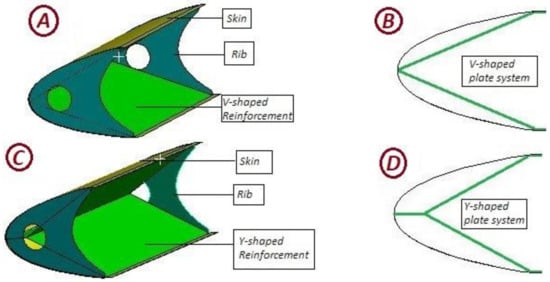 Next, the investigated structural reinforcement of the Y-shaped plate system and V-shaped plate system is illustrated in Figure 3. The skin of the leading edge is assumed to be 2.7 mm thick and made of Aluminum-2024-T3 alloy while the ribs are assumed to be 2.1 mm thick made of Aluminum-7075-T6 alloy. The thickness of the Y-shaped and V-shaped plate systems are kept as 2.4 mm made of Aluminum-7075-T6 alloy. Nonetheless, the V-shaped reinforcement weighs 8.7% higher than Y-shaped reinforcement.