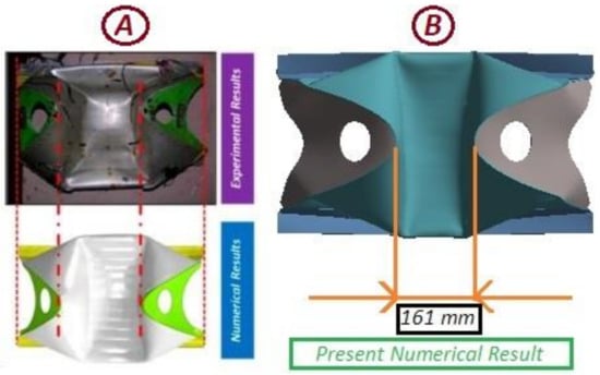 Post impact permanent deformation. (A) Experimental and numerical results from the reference. Reprinted with permission from Refs. [25,34]. 2020 [25] and 2019 [34], Di Caprio et al.; (B) Present numerical result.