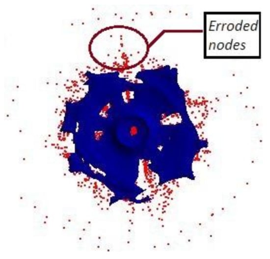 For the current study, the computational bird model is presented as the Lagrange model with node erosion algorithm, where the highly distorted nodes are removed from the solver after the impact has taken place to stabilize the solution procedure [37], as shown in Figure 5. Moreover, Mooney–Rivlin material parameters are selected, which can be found in Table 2.
