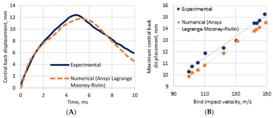 Both the Lagrange bird model and material parameters are validated against the experimental data found in the literature [31,38]. In Figure 6A, central back displacement data of an aluminum plate impacted by a ballistic gelatin bird projectile are experimentally measured by the direct image correlation (DIC) method at an impact velocity of 122 m/s, which is compared with the numerical outcomes adopting Ansys. Furthermore, in Figure 6B, the maximum central back displacement values at different impact velocities are correlated. From both the graphs, it is evident that the numerical and experimental data are in excellent agreement.