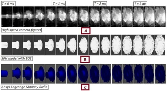 Finally, the radial spread of the gelatine bird projectile captured by a high-speed camera during experimentation and adopting the SPH method is compared with the current numerical bird model, as shown in Figure 7. An excellent correlation is observed with illustrations found in the literature [38]. In summary, it can be concluded that the Lagrange bird model with node erosion algorithm and Mooney–Rivlin material parameters can be successfully adopted as bird model for the current investigation.
