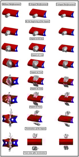 At first, the impact events are discussed from the computational bird model’s point of view, as shown in Figure 8. At the beginning of the impact event, to be precise at 0.5 milliseconds, radial deformation of the bird starts to take place and no visual differences among the leading edge models are observed. However, as time progresses, at 1 millisecond, the bird continues to deform radially for the leading edge without any reinforcement while a tendency of splitting the bird into two pieces is observed for both the V-shaped and Y-shaped reinforcement. Afterwards, at 2 milliseconds, the whole bird model is almost split into half while impacting with reinforced leading edges. In contrast, half of the bird is radially deformed for the case of leading edge without any reinforcement. At 3 milliseconds, the split of the bird is fully completed which is more apparent at 4 milliseconds for reinforcements. Nonetheless, deformation continues to take place for the leading edge having no reinforcement and a fully deformed shape of the bird model can be seen after the termination of the solution, completely crashing on the wing surface. Lastly, it is found that for both the reinforcement types, the bird model impact events are identical.