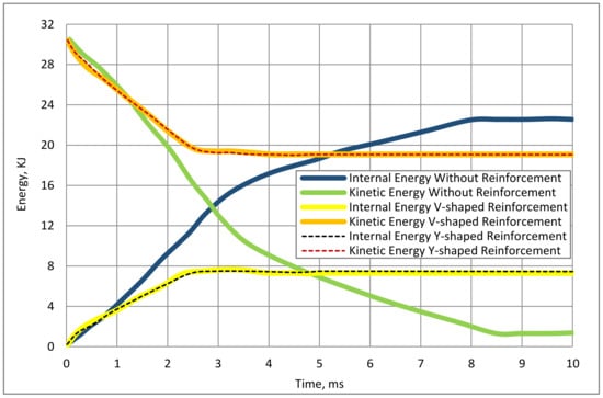 Next, energy conversion data of the whole system comprising both the test rig and leading edge with and without reinforcement can be found in Figure 9. From the illustration, it is evident that most of the kinetic energy of the bird is converged to internal energy for the case of leading edge without any reinforcement. The maximum internal energy reaches the peak value of 22.62 KJ at 8 ms and stabilizes afterward. However, for the case of reinforcements, a completely different scenario can be observed, where the kinetic energy of the bird decreases from 30.4 KJ to 19 KJ and continues to retain the energy. This phenomenon can be described from the previous illustration (Figure 8) where the bird, after being impacted, is sliced into two pieces due to the presence of the reinforcements. Thus, a full crashing of the bird model does not take place and the specified kinetic energy remains in the bird model. Therefore, the system with reinforcements requires the absorption of less kinetic energy, and the maximum peak values of 7.63 KJ and 7.49 KJ internal energy are produced by V-shaped and Y-shaped reinforcements, respectively, which stabilizes at 2.5 milliseconds. Similar to the previous bird strike events, both reinforcement types exhibit almost identical energy summary, generating approximately 67% less internal energy than the system without reinforcement.