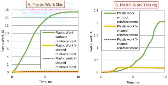 Focusing on the plastic work of the skin as illustrated in Figure 10A, it can be seen that the skin without reinforcement experiences a large plastic deformation. The plastic work done by the skin is around 15.44 KJ which is 68.4% of the internal energy of the skin. In contrast, plastic work of the skin with reinforcements is insignificant, to be specific, only 0.21 KJ and suggests a small area of plastic deformation due to the bird strike events. Furthermore, the test rig installed with the leading edge having no reinforcement carries out 2.05 KJ plastic work which can not be neglected considering the contribution to be around 9% of the total internal energy of the system, as shown in Figure 10B. On the other hand, the plastic work of the test rigs with reinforced leading edges is considerably low, only around 0.18 KJ.