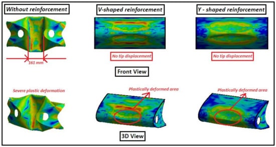 In terms of plastic displacement and tip displacement, a comparison is also made with other available reinforcement types found in the literature [24,25,34], as shown in Figure 12. From the illustration, it is apparent that despite being reinforced, all other leading edges have a significant plastic deformation and only provide protection for not being penetrated fully due to the impact, complying with the FAR 25.631 regulations. However, the Y-shaped and V-shaped reinforced leading edges not only satisfy the regulations but also ensure a better aerodynamically shaped structure. It is also noteworthy that other reinforcements cannot split the bird into two pieces and have to absorb all the kinetic energy of the bird until it completely gets demolished.