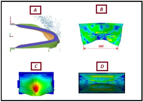 Finally, the validation of the present numerical model is illustrated in Figure 4 against the experimental and numerical findings of the adopted reference. From the figure, it is evident that the permanent deformation pattern of the skin is similar to the experimental and numerical findings of the reference. Additionally, no penetration is found despite the fact that the distance between the tips of the two ribs after permanent deformation is 161 mm (Figure 4B) while in the reference this value is approximately 293 mm. This discrepancy can be explained based on the materials used for the experimental test article. In the reference, a honeycomb core is adopted which is 6.35 mm high and has an aluminum 2024-T3 made outer and inner face thickness of 1.4 mm and 0.4 mm, respectively. For the present study, the thickness of the skin is simplified to 2.7 mm without any honeycomb core since the main objective of the research is to study the effectiveness of structural reinforcement on the leading edge while in the reference the honeycomb core is used as reinforcement.