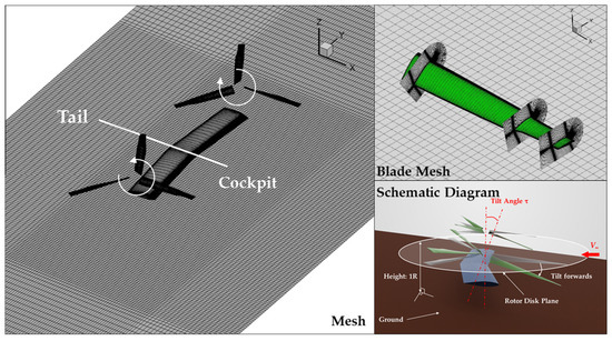 Shipboard take-offs and landings by a tiltrotor can be regarded as low-speed near-ground flight maneuvers. Researchers have investigated near-ground flight, take-off, and landing by helicopters using simulations and theoretical analyses. Many studies used the free-wake method [2,3,4]. Kang and Sun [4] used this method to calculate the flow field of bi-rotor aircraft, to determine the shape of the wake during near-ground flight. However, it is difficult to simulate the flow field of a tiltrotor during shipboard take-off and landing using the wake model. After CFD methods became more popular in rotor aerodynamic studies, more accurate rotor wakes and blade air-loads were simulated. Hwang et al. [5] used an unstructured overset mesh method to study the ground effect of different rotors to predict the vortex structure and wake shape more accurately. Lakshminarayan et al. [6] performed detailed simulations of the vortex nucleus positions and downwash velocities at different heights. The results provided a good match with the test points. Young [7] used CFD to calculate the aerodynamic characteristics of tiltrotors approaching a building during near-ground flight, to study the changes in the aerodynamic environment. However, few studies have been conducted on near-ground flights of tiltrotors, especially numerical simulations that consider the tiltrotor’s take-off and landing flow field.