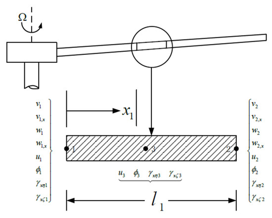 A rotary beam CSD solver is develop by the authors. The beam element model in the CSD calculation is based on the Timoshenko beam [25]. The explicit precise time-integration method [26] is used to obtain the displacement solution corresponding to the blade airload. The blade beam model based on the Timoshenko beam has 20 degrees of freedom, including 4 degrees of freedom of the middle node of the element and 8 degrees of freedom of the nodes at both ends. The degrees of freedom describe the displacement angles , , the rotation angles , , the torsion displacement , the tensile displacement , and the sectional shear , of the flap and lag directions, respectively. The degrees of freedom are shown in Figure 3. The following interpolation equation for the Timoshenko beam is used to determine the displacement of the blade: