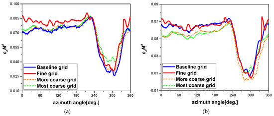 Normal force coefficient comparison of the four grid systems. (a) r/R = 0.85. (b) r/R = 0.9.