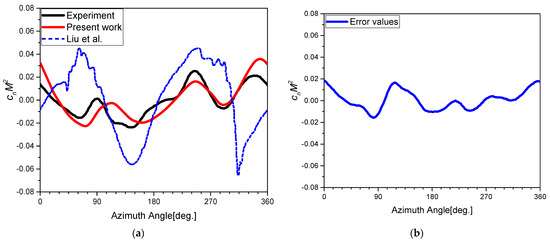 Sectional normal force at 87%R (mean removed and high-frequency content filtered): (a) original results; (b) error values of the results between the calculations in the present work and the experiment.