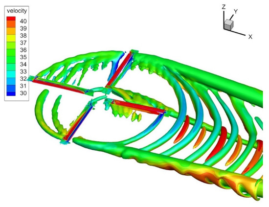 When the tiltrotor is taking off and landing on the ship, it needs to fly with a low tilt angle to overcome the forward/backward incoming flow due to the ship’s movement. Here, the incoming flow speed is set to 15 knots, and take-offs and landings with small forward/backward tilt angles are simulated. The tilt angle is denoted as τ, and a forward tilt angle is considered positive. Figure 15 shows the iso-surface of the Q-criterion and the corresponding streamlines at 0.5R for different scenarios (side view). In the backward tilt scenario, the incoming flow is from the trailing edge of the wing to the leading edge. A wing vortex is generated at the leading edge and develops against the wind toward the trailing edge; then, it contacts with the vortex from the trailing edge and merges with the wake generated by the rotor. However, the vortex generated by the wing’s trailing edge in the forward tilt scenario develops downwind and does not merge with the rotor wake. The nucleus of the position where the vortex rolls up on the ship’s deck is at the equal height of the wing in the backward tilt scenario. When interference occurs due to the shedding vortex from the trailing edge of the wing, the rolling vortex nucleus is not close to the ship’s deck but instead at a height of about 0.25R.