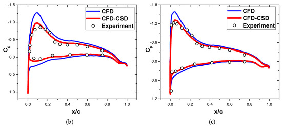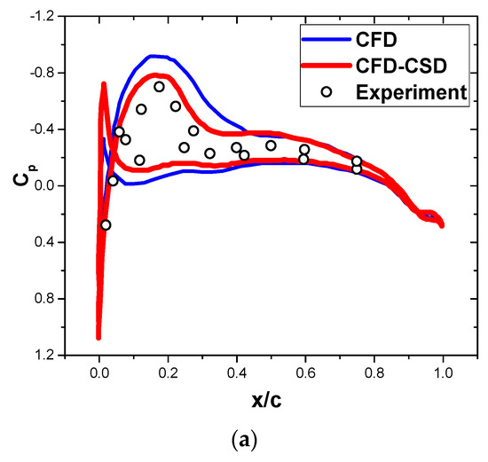 The pressure coefficient of the Helishape 7A rotor is calculated with the CFD-CSD coupling method to illustrate the utility of this method. The parameter values are Mtip = 0.656 and μ = 0.4. Figure 10 shows the pressure coefficients obtained from the CFD and CFD-CSD methods and the experimental data [16,33] of the 0.975R section on the rotor’s front and side. The azimuth angle of 0° is defined at the rear of the rotor, and it increases with the direction of the rotor. The data of concerns the front and the others concern the side of the rotor. Since the proposed method considers the effect of deformation on the aerodynamic characteristics of the blade, its results are closer to the experimental data than that of the CFD method, and the calculation accuracy is high. In this scenario, the rotor operates at high speed and with an advance ratio close to the general working state of the tiltrotor. Due to a lack of sufficient experimental data on the XV-15 tiltrotor, the coupling method is necessary to study the aerodynamic characteristics of the rotor at high rotation speeds.