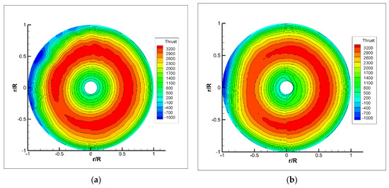 Thrust distribution of the rotor at different heights: (a) 1R height, rotor with a wing; (b) 1R height, rotor without a wing.