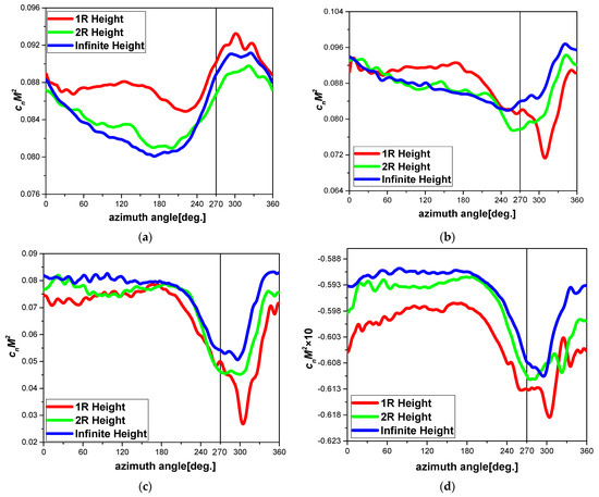 Figure 13 shows the normal force coefficient versus the azimuth angle of the 0.5R, 0.7R, 0.8R, and 0.95R sections at different heights. In the 0.5R section, the normal force coefficient is the largest near the azimuth angle of the wing (), but the increase at 1R height is significantly smaller than that of the OGE case. At 1R height, the increase in the thrust resulting from the equivalent ground effect of the wing surpasses the influence of the fountain flow in this section. In the sections close to the blade tip, a drop in the normal force occurs near , and the minimum value is observed at about . But in the section 0.5R, the normal force increases rather than drops near , and the azimuth angle of minimum value in blade tip section is that of maximum value at 0.5R section. It can be concluded that, for sections close to blade tip, the fountain flow is the dominant factor affecting the normal force at azimuth angle of around 270°. The wing’s equivalent ground effect is less pronounced in these areas. For the sections closer to blade root, as mentioned before, the fountain flow effect is less than the blade tip, and the wing’s equivalent ground effect make the normal force increase up to the maximum of the whole revolution.
