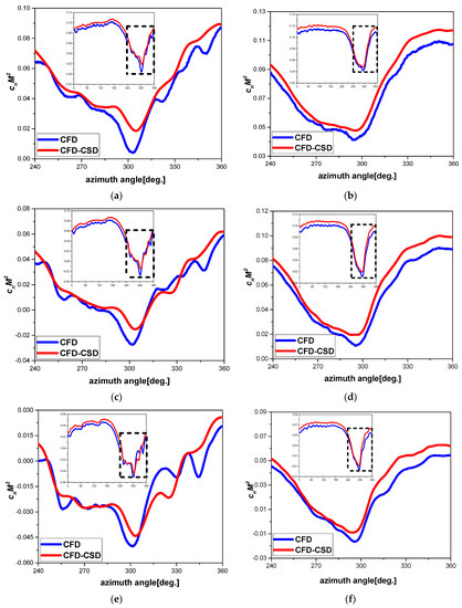 Figure 19 shows the comparison of the normal force coefficient between the CFD results and coupled CFD-CSD results for a tilt angle of τ = −5°. The results of the range are enlarged. The fluctuations are smaller in the CFD-CSD than in the CFD results. Similar to the scenarios when the ship is not moving, it is easier to observe the influence of the blade elasticity on the aerodynamic calculation in the region where the blade air-load fluctuation frequency is larger. The elastic deformation decreases the amplitude of the normal force coefficient fluctuations at the rotor tip. The aerodynamic forces are external forces for structural dynamic equations and the deformation solutions in the equations vary at the same frequency as the external forces. Where the aerodynamic forces fluctuate with high frequency, the elastic deformation also generates high-frequency fluctuation, which results in a sensitivity to elasticity in these positions. Therefore, the difference is larger in the CFD-CSD results than the CFD results because the latter assumes a rigid blade.