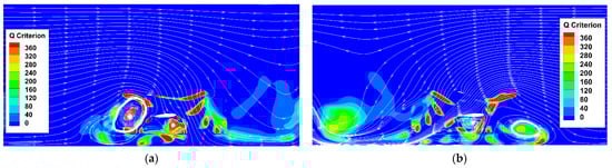 Streamlines and contours of the Q criterion at 1R height (front view): (a) 1R height, rotors with a wing; (b) 1R height, rotors without a wing.