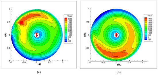The backward and forward tilt scenarios have different blade air-loads due to the different vorticities. Figure 16 compares the thrust for the different scenarios; the black arrow indicates the direction of the incoming flow. Regardless of whether the rotor is tilted forward or backward, the thrust is always higher downstream, and the center of the incremental zone is vertically above the wing. Combined with the results of the vorticity contours, it is concluded that the equivalent ground effect of the wing and the interference by the wing vortex on the rotor wake have caused this thrust distribution. The wing has a significant impact on the rotor when the tiltrotor takes off and lands with a small tilt angle as the ship is moving.