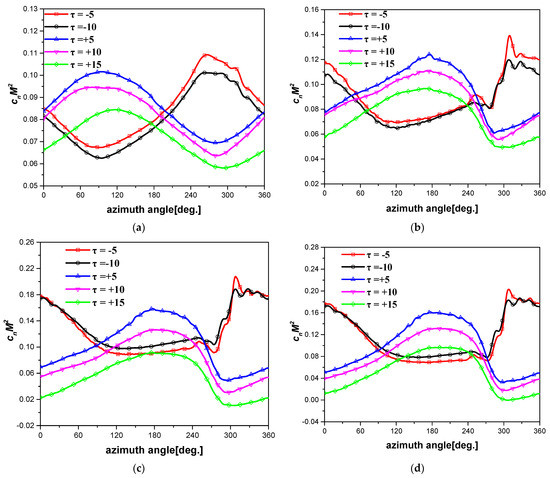 Normal force coefficient versus azimuth angle. (a) r/R = 0.5. (b) r/R = 0.7. (c) r/R = 0.75. (d) r/R = 0.8.