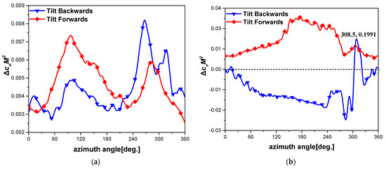 Figure 17 shows the normal force coefficient versus the azimuth angle in different sections. The variation trends of the normal force are opposite in the forward and backward scenarios, i.e., the peaks in the forward tilt scenarios are the valleys in the backward scenarios and vice versa. Regardless of whether the rotor is tilted forward or backward, the normal force of a smaller tilt angle is higher than that of a larger angle in the 0.5R and 0.7R sections. As the tilt angle increases, the windward area of the rotor increases, resulting in a rise in resistance. However, close to the tip, the trend of the force of the backward tilt differs from the other scenarios. When the rotor is tilted backward, a small period of fluctuations in the normal force occurs around . As shown in Figure 15, this is the position where the rotor wake and the wing vortex merge, i.e., the unstable flow field that leads to the fluctuation. Figure 18 shows the difference in the normal force coefficients versus the azimuth angle for the 5° and 10° forward/backward tilt angles in sections 0.5R and 0.8R. In section 0.5R, the curves of the forward and backward tilt scenarios cross, and the amplitude of the fluctuation is much smaller than that at 0.8R. It is only about 1/7 for the backward tilt and about 1/4 for the forward tilt. In section 0.8R, the difference in the coefficients is similar for the backward and forward tilt scenarios, but there is a large peak at around .