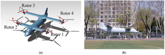 The flight dynamics model is composed of the aerodynamic models of each component, including the rotor, wing, fuselage, and vertical fin. In this article, the model was developed based on the QTR configuration as shown in Figure 1, which was designed and manufactured by the laboratory at Nanjing University of Aeronautics and Astronautics. It can be seen that the rotors are installed at both ends of the front and rear wings, and the rotors can tilt with the nacelle around the axis. In the four rotors, the rotational directions of the diagonal rotors are the same, while the adjacent is opposite. The rotors are numbered 1, 2, 3, 4, and rotor 1 is right-handed. The flaperons are adopted on each wing surface, and they can be activated collaboratively and differentially to represent the function of the aileron and the elevator. The rudder is installed on the vertical fin to provide heading control. The general parameters of the quad tiltrotor can be seen in Table 1.