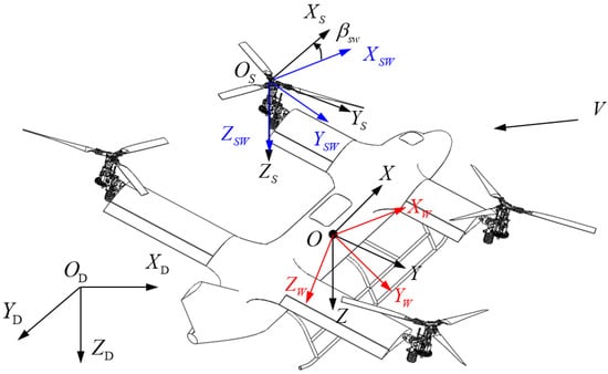 Definition of coordinate systems. where O is the center of gravity of the QTR; V is the inflow velocity; ODXDYDZD is the inertial coordinate system; OXYZ is the body coordinate system; OWXWYWZW is the wind axis; OSXSYSZS is the rotor fixed axis coordinate; OSWXSWYSWZSW is the rotor wind coordinate, in which OSWXSW is the projection of the velocity V onto the OSWXSWYSW plane; βsw, the side-slip angle of the rotor is the angle between OSXS axis and OSWXSW axis.