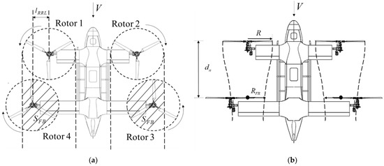 where lRRL is the lateral distance between the centre of the front and rear rotors, SFB is the area of the shaded part, as shown in Figure 4a. Thus, the corresponding induced velocity increments can be written as: