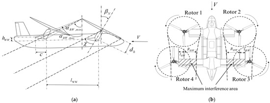 The side view of the interference is illustrated in Figure 5a, in which αRW,min is the critical angle of the front rotor that starts to interfere with the rear wing; αRW,max is the angle that the rear wing starts to be entirely immersed in the wake of the front rotor; hWW is the height difference of the front-rear wings; lWW is the longitudinal distance between the front and rear wings; dh is the distance between the rotor hub centre and the tilting axis. Therefore, the relevant angles can be calculated using the following equations.