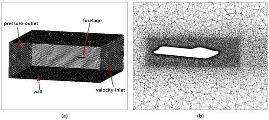 Numerical simulation of the fuselage aerodynamics. (a) Overall meshing. (b) Mesh details.
