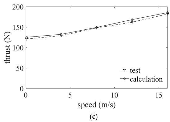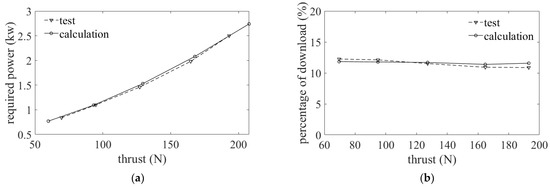 Additionally, the rotor–wing interaction was implemented in the article. However, due to the restriction of the wind tunnel facilities, the interaction test only included rear rotors to the rear wing in the hover state, which can be seen in Figure 7c. The wing’s download caused by the rotor thrust could be measured with different collective inputs that involve and . In these two experiments, the rotor rotational speeds were set to be 2100 rpm. The comparisons between test and calculation are shown in Figure 8.