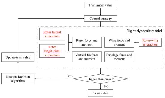 Combined with Equation (29), the Newton–Raphson algorithm is used to solve the equilibrium equations. The trim characteristics can be calculated with and without interference according to the procedure diagram shown in Figure 10.